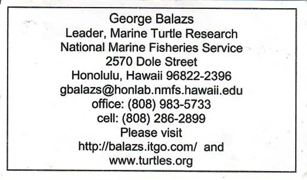 Balazs (1990) Sea Turtle Tag Center of the Pacific. NMFS Honolulu Laboratory.